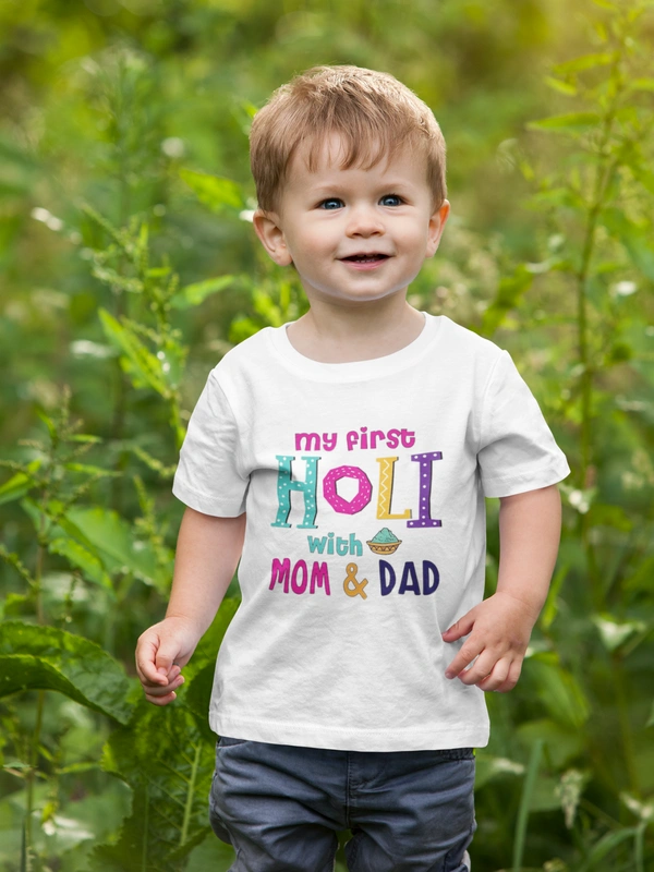BBGMy First Holi with MOm Dad Design Printed Holi Tshirt for 0-12 Months 160 gsm polyester